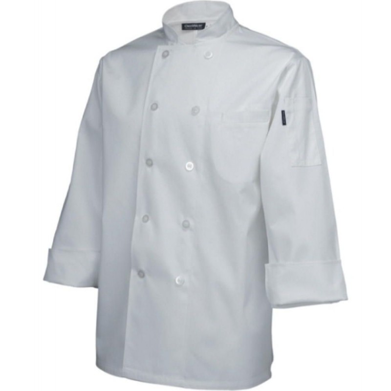 This hard wearing and comfortable Small White Standard Jacket with Long Sleeves is ideal for any busy kitchen. Unisex double breasted design with durable double stitched seams, hemmed cuffs, thermometer pocket on sleeve and fixed button fastening. Made from polycotton blends providing good resistance to staining improving wearability and longevity. Suitable for commercial laundering. To fit chest 36"-38". Short sleeve variation also available.