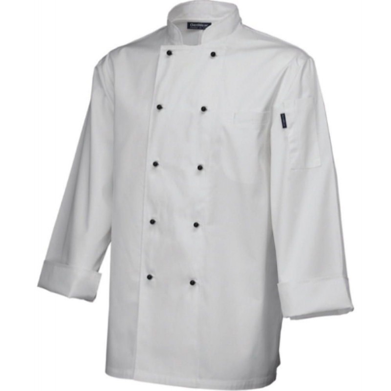 This traditional style XX Large White Superior Jacket with Long Sleeves is designed for comfort and practicality for any busy kitchen. Unisex double breasted design with durable double stitched seams, hemmed cuffs, thermometer pocket on sleeve and supplied with 12 removable black stud buttons (spare stud buttons available). Made from polycotton blends providing good resistance to staining improving wearability and longevity. Suitable for commercial laundering. To fit chest 52"-54". Short sleeve variation also available.